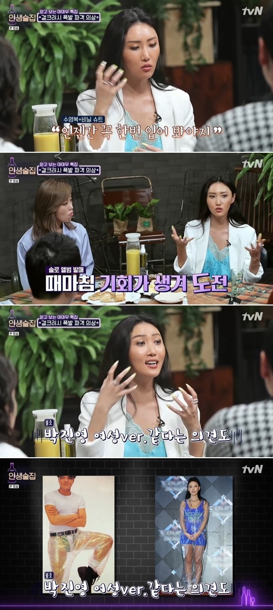 화사는 "예쁘다고 생각했는데 호불호가 정말 많이 갈렸다. 좋아한 사람은 멋있다고 했는데 일부는 '박진영 여자 ver.'이냐고 하더라. 박진영 씨 따라한게 아니냐고 하는데 절대 아니다"라고 못을 박았다. 이에 한혜진은 "진짜 멋있던데"라고 칭찬했다.
