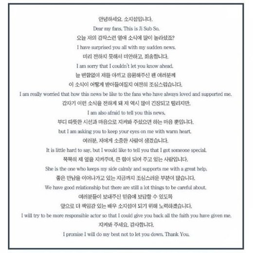 이어 소지섭은 "여러분, 저에게 소중한 사람이 생겼다. 묵묵히 제 옆을 지켜주며 큰 힘이 되어 주고 있는 사람이다다. 좋은 만남을 이어나가고 있는 지금까지 조심스러운 부분이 많다"라면서 "여러분들이 보내주신 믿음에 보답할 수 있도록 앞으로 더 책임감 있는 배우 소지섭이 되기 위해 노력하겠다"라고 지지를 당부했다.