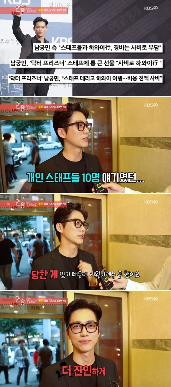 이날 리포터는 남궁민에게 "지금 굉장히 아름다운 소식이 들린다"고 말을 꺼냈다. 최근 남궁민이 스태프들에게 하와이 여행을 쏜다고 기사가 나온 것을 언급한 것.
