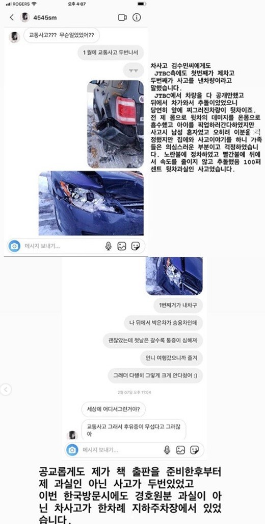 윤지오는 김수민 작가와 나눈 모바일 메신저 대화 내용을 공개하며 "차 사고 김수민 씨에게도, JTBC 측에도 첫 번째가 제 차고 두 번째가 사고 차량이라고 말했다"라고 설명했다.