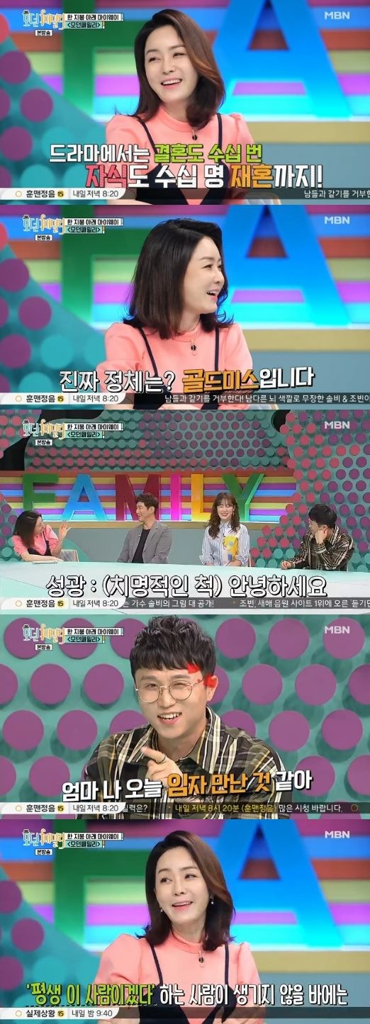 이날 김정난은 결혼, 이혼 루머에 대해 해명했다. 그는 "드라마 안에서는 결혼도 수십번 했고, 자식도 수십 명 낳았다"며 "(실제로는) 골드미스다. 이 생활에 만족하면서 살고 있다"고 말했다.