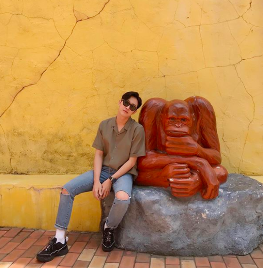 진영은 16일 자신의 인스타그램에 "가족 여행"이라는 메시지와 함께 세 장의 사진을 게재했다. 공개된 사진을 보면 진영은 오랑우탄 동상 옆에 앉아 포즈를 취했다.