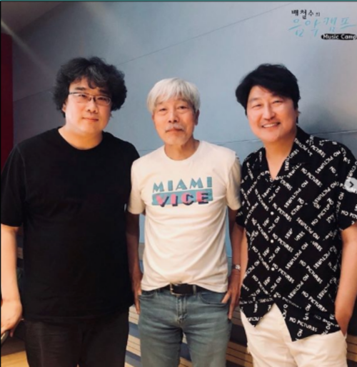 배철수는 16일 자신의 SNS에 "영화 ‘기생충’의 배우 ‘송강호’와 감독 ‘봉준호’. 목요일 저녁 7시 ‘배철수의 음악캠프’"라는 글과 함께 사진을 게재했다.