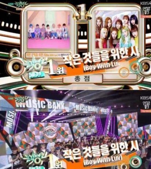 방탄소년단은 이날 방송된 ‘ 뮤직뱅크’에서 활동을 마무리지었음에도 불구하고 ‘작은 것들을 위한 시(Boy With Luv)’로 1위를 차지했다. 투어 중으로 방송에 출연하지 못해 지민이 SNS를 통해 소감을 대신 전한 것.