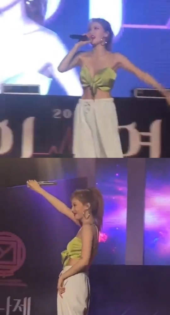 하지만 격한 퍼포먼스 탓에 가슴을 감싸는 리본이 풀리며 노출 사고의 위험에 처했다.
