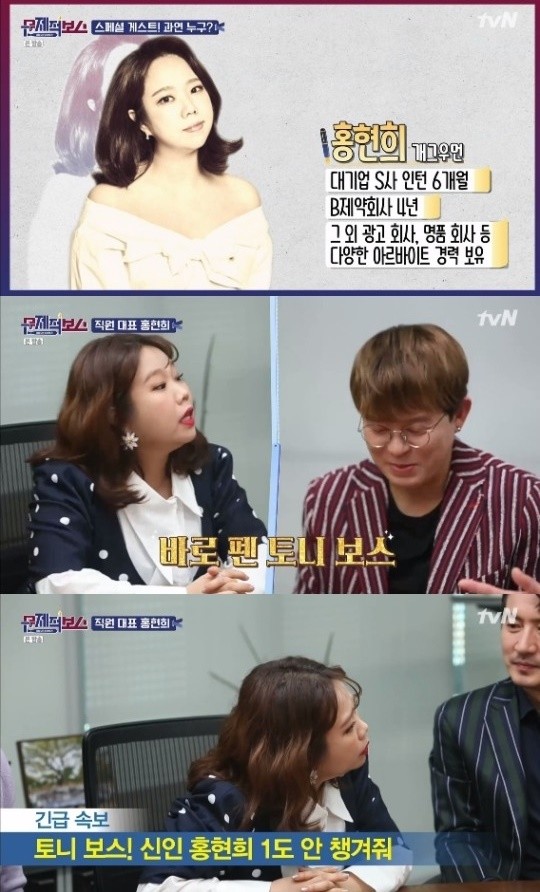 최근 방송된 tvN '문제적 보스'에서는 토니 회사에서 일한 직원으로 홍현희가 게스트로 등장했다. 두 사람의 놀라운 인연은 좌중의 이목을 모았다.
