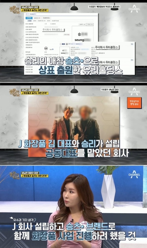 한 기자는 "승리가 화장품 브랜드 J사의 관계사 대표이자 클럽을 운영했다. 내가 운영하는 클럽에서 회식을 하자고 자연스럽게 이루어졌을 가능성이 있다"고 말했다. 또 다른 기자는 "승츠비 상표 출원한게 유리 홀딩스다. J회사 역시 상표 출원을 했다. J 타운이 승리와 지금 대표가 공동 설립을 했다. 지금은 유리 홀딩스의 유 대표와 김 대표가 공동 대표이다. J 회사를 설립하고 승츠비 브랜드로 화장품 사업을 진행하려 하지 않았을까 싶다"고 말했다.