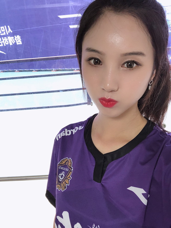 특히 뚜렷하고 조화로운 이목구비는 뭇 남성팬들의 마음을 사로잡았으며 FC안양 유니폼을 착용하며 "FC안양 파이팅 비오는날 우리선수들 부상없이 홧팅! 비오는 날씨에도 우리 팬들, 멋진 FC안양 서포터즈 최고!"라는 글과 함께 카메라를 응시하고 있다.