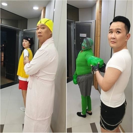 공개된 사진 속 박준형, 김지혜 부부와 정경미, 윤형빈 부부가 같은 포즈로 카메라를 바라보고 있다. 특히 정경미가 파격적인 분장을 하고 있는 모습이 웃음을 자아낸다.