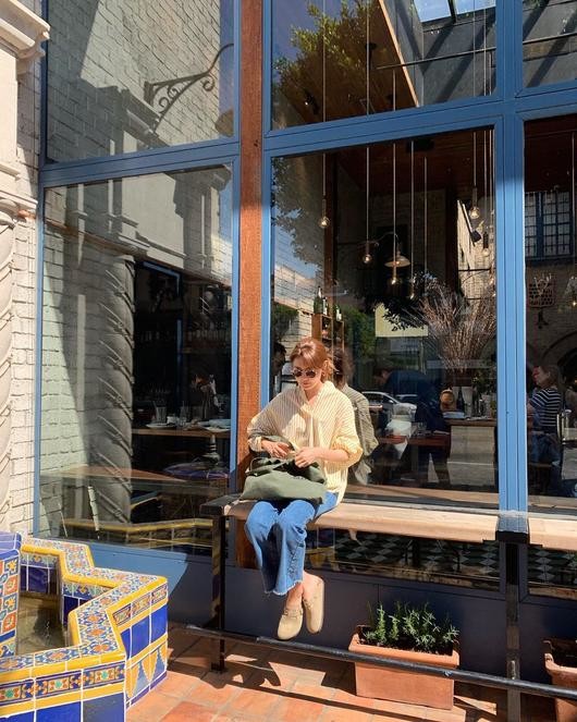 공개된 사진 속 수영은 선글라스를 끼고 의자에 앉아 사진을 찍고 있다. 수영은 노란색 셔츠와 청바지를 매치해 화사한 분위기를 자아냈다.