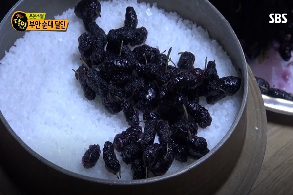 보라색 소금이 제작진의 카메라에 포착됐다. 왕겨로 찐 오디+소금으로 막창을 손질해 누린내를 잡고 쫄깃한 식감을 더했다.