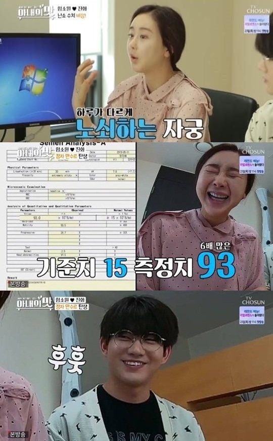 검사를 받기 시작했다. 채혈 검사, 정자 검사 등이 이뤄졌다. 검사 결과 의사는 진화와 관련, "정액검사 수치는 정상이다. 운동성이 살짝 기준치 미달이나 정자수가 기준보다 많다. 기준치가 15라고 할 때 측정치가 93이다"라고 말했다. '정자 만수르'의 탄생이었다. 함소원은 이전보다 난자 수치가 떨어졌다.
