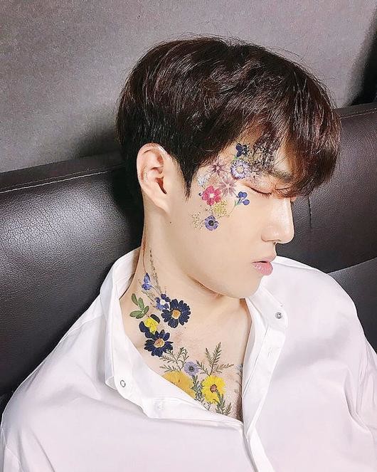 공개된 사진 속에는 얼굴과 몸에 타투가 그려진 채로 소파에 누워 잠을 청하고 있는 수호의 모습이 담겨있다. 갸름한 턱선과 오똑한 콧날이 시선을 사로잡는다.