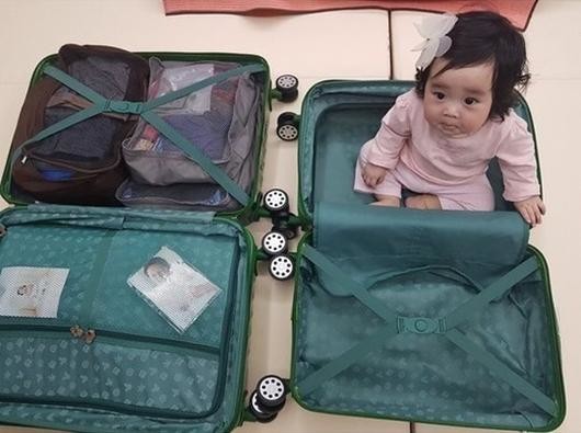 공개된 사진에는 캐리어에 들어가 뾰루퉁한 표정을 짓고 있는 딸의 모습이 담겨 있다. 금방이라도 울 것 같은 딸의 귀여운 모습에 미소를 짓게 한다.
