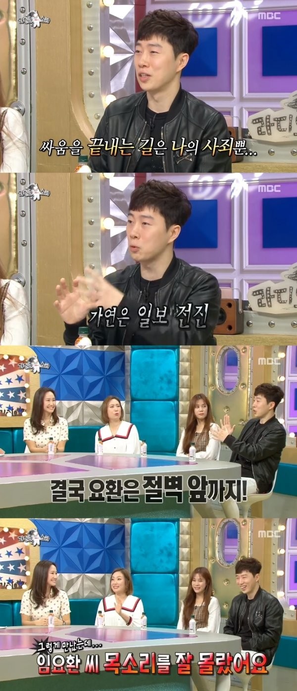 이에 김구라는 “그래도 생각하는 주체 아니냐”고 임요환에게 핀잔을 줬다. 이후 임요환은 “가연 씨와 말다툼을 하면 내가 앞으로 나가면 가연 씨가 뒤로 물러나야 한다. 그러지 않고 더 앞으로 온다. 그렇게 뒤로 밀려가다보면 절벽”이라고 말해 웃음을 자아냈다.