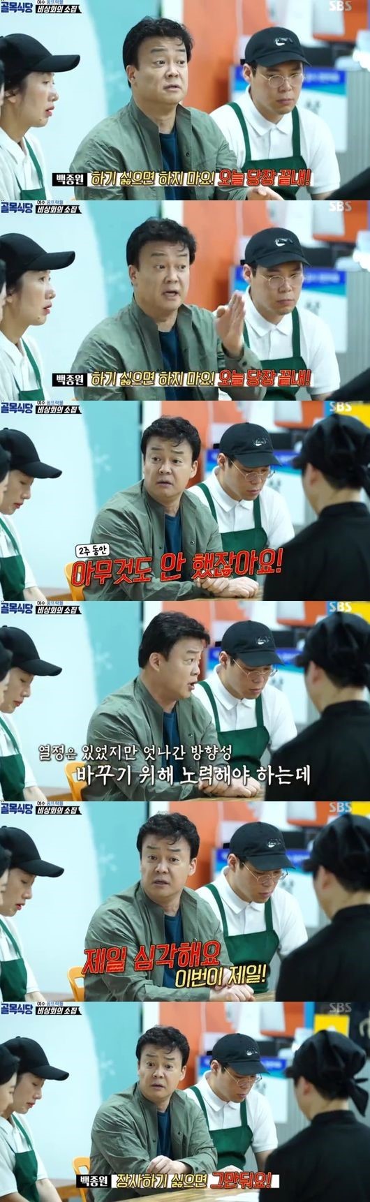 백종원은 그동안 다른 집에 한 칭찬도 격려와 용기를 주기 위한 말들이었다면서 "원래라면 이런 사람들 장사하지 말아야한다"고 분노했다. 백종원은 "매번 나도 스트레스 받아, 2주동안 아무것도 안했다"며 목소리를 높이면서 "열정은 있었지만 엇나간 방향성을 바꾸기 위해 노력해야하는데 내가 떠먹여 줘야하냐"고 말했다.