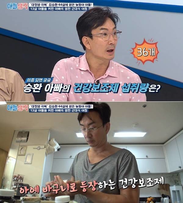 이날 김승환은 다른 식구들과 달리 아침밥을 선식으로 대신하는 모습을 보였다. 그는 선식과 함께 건강보조제 수십 개를 연달아 섭취해 스튜디오에 있는 출연진들을 깜짝 놀라게 했다.