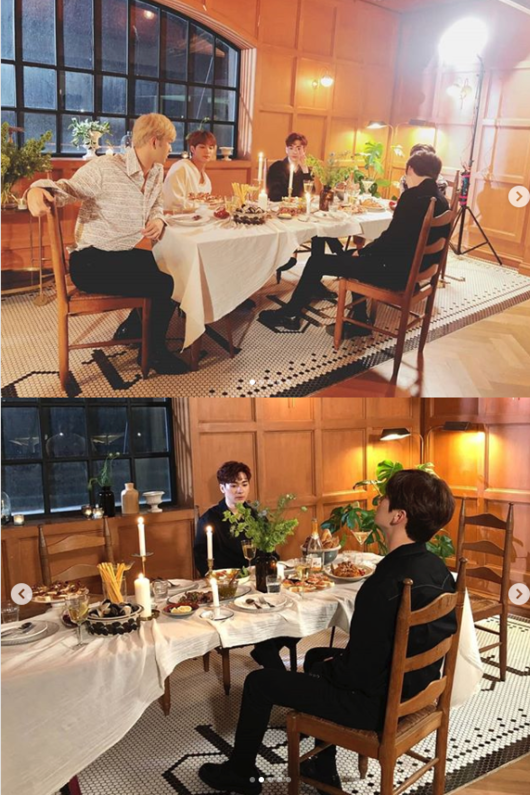 사진에서 뉴이스트 멤버 백호, JR, 아론, 렌, 민현은 긴 탁자에 둘러앉아 만찬을 즐기고 있다. 한껏 차려입고서 분위기에 취한 이들의 비주얼은 5인의 왕자님 그 자체다.
