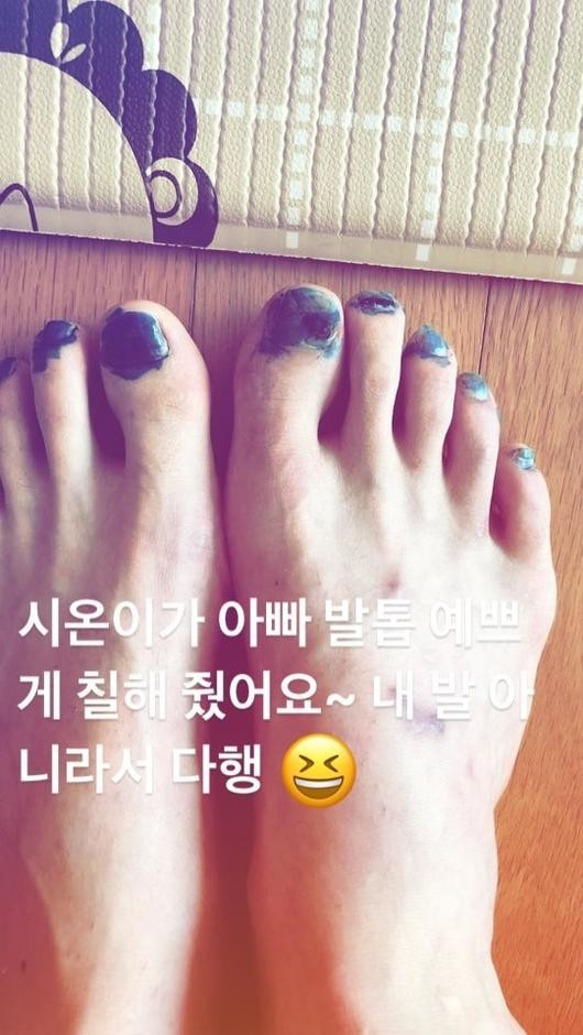 23일 배우 한혜진은 자신의 인스타그램을 통해 "시온이가 아빠 발톱 예쁘게 칠해줬어요. 내 발 아니라서 다행 ^^"이라는 글과 함께 근황을 담은 사진을 공개했다.