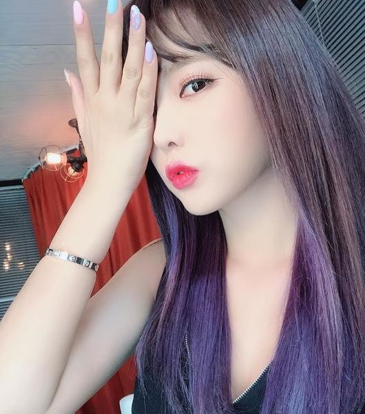 공개된 사진 속 홍진영은 한쪽 눈을 가리고 입술을 내밀 채 카메라를 응시하고 있다. 보라색으로 염색한 홍진영의 모습이 신비로운 분위기를 자아내고 있다.