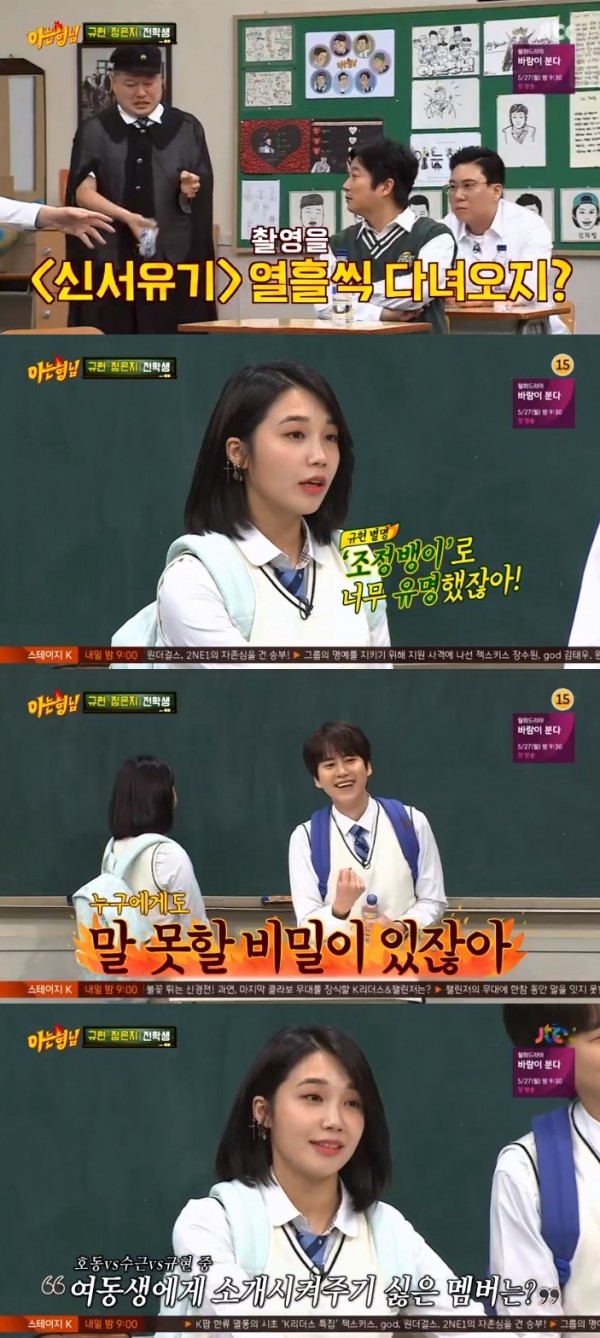 정은지는 규현에 관해 “‘신서유기’ 때 조정뱅이로 유명했다. 당시 여동생에게 소개시켜주기 싫은 멤버로 규현이 뽑혔는데. 왜 그런 건지 궁금했다”고 말했다.