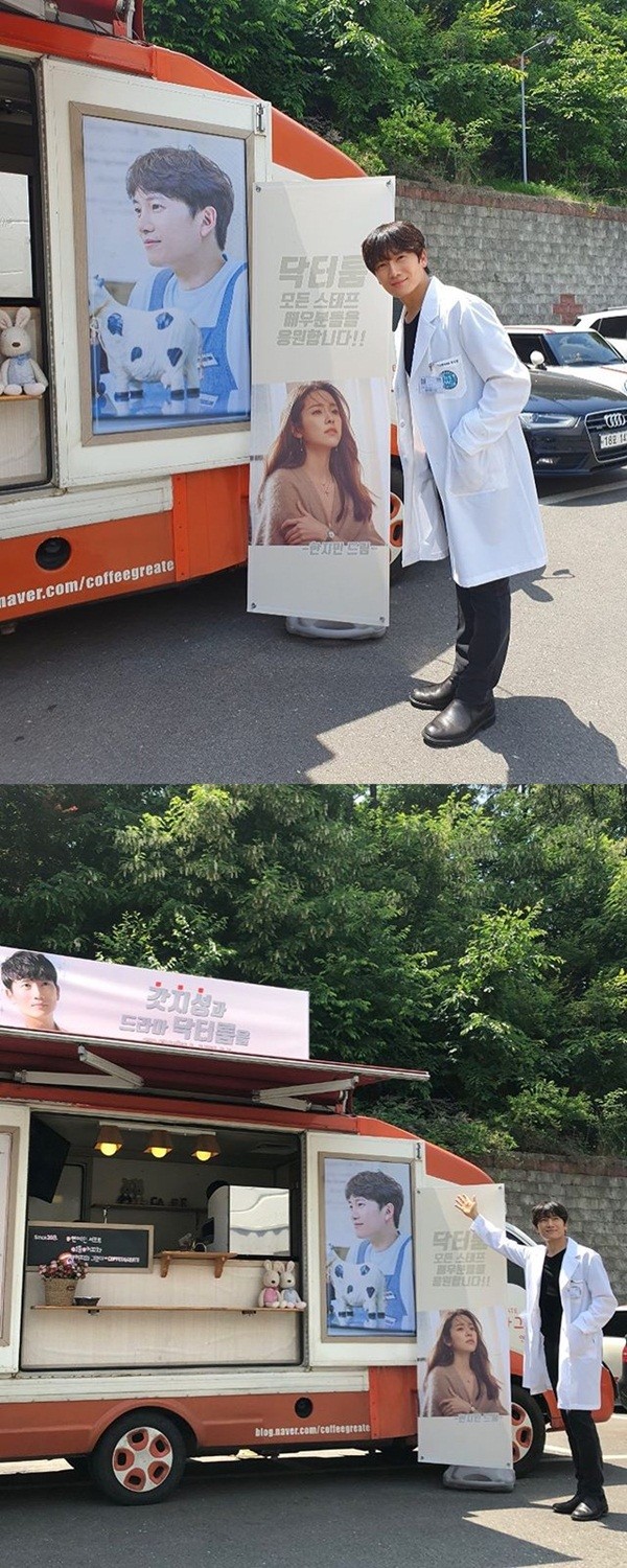 한지민은 커피차에 "'닥터룸' 모든 스태프, 배우들을 응원합니다. 갓지성"이라는 문구를 전하며 우정을 드러냈다.