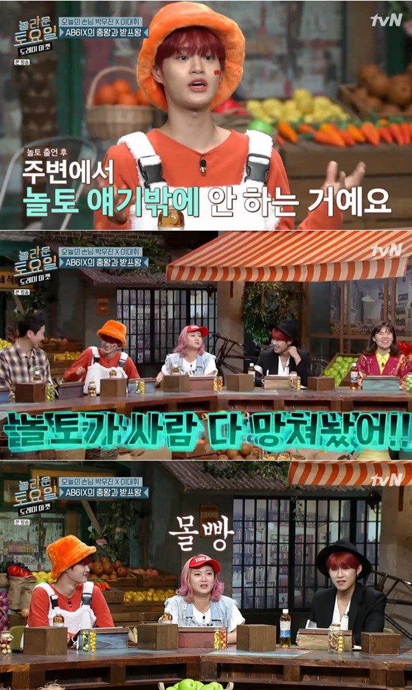 최근 방송된 케이블채널 tvN 예능프로그램 ‘놀라운 토요일-도레미 마켓’에는 에이비식스(AB6IX) 박우진, 이대휘, 개그우먼 박지선이 게스트로 출연했다. 이날 ‘놀라운 토요일-도레미 마켓’에서 지난 출연에 맹활약을 펼쳤던 이대휘는 “‘놀토’ 나오고 주변에서 ‘놀토’ 이야기만 한다. 그냥 듣는 귀가 좋을 뿐이다”며 너스레를 떨며 시청자들의 이목을 사로잡았다.