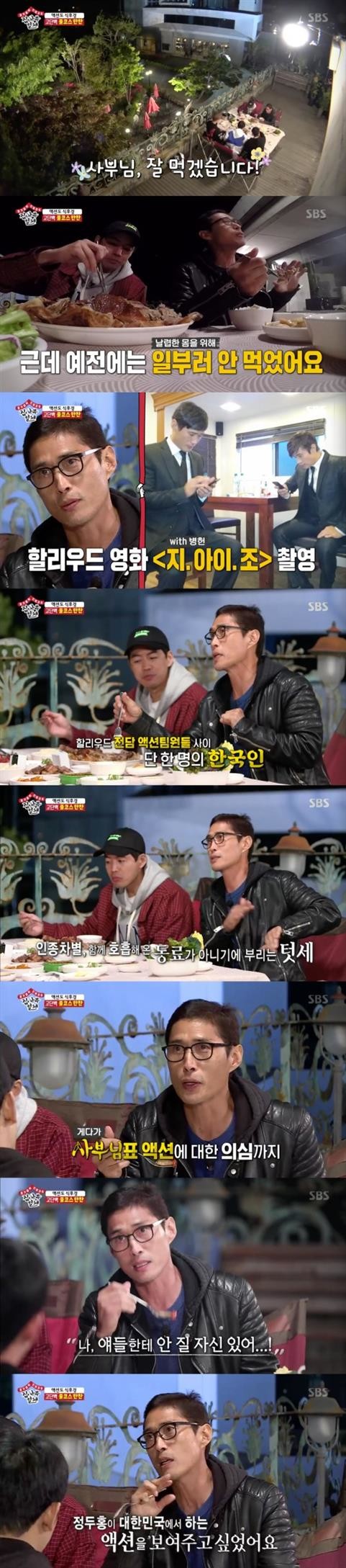 이날 방송에서 상승형재는 정두홍 사부의 액션 레슨이 끝나고 그가 준비한 고단백 식사를 하며 행복을 만끽했다.
