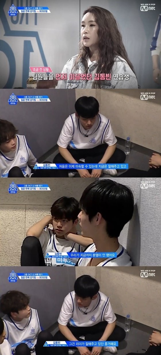 이미담 연습생이 고민을 털어놓자 김동빈 연습생은 "처음은 미숙할 수 있는데 지금은 잘해주고 있다"며 "우리가 지금까지 분열이 안됐다. 그건 리더가 잘해주고 있단 증거다"라고 격려했다.