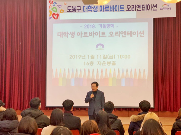 | ▲ 올해 '겨울방학 대학생 아르바이트 오리엔테이션'에서 이동진 구청장이 학생들에게 인사말을 전하는 모습. (사진제공=도봉구청) | ||