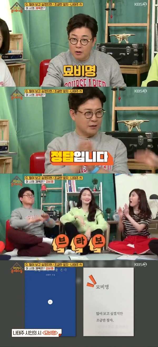 출연자들은 'TV' '임신' '내일' '로또' 등 각종 오답 행렬을 이어가며 시의 제목을 추리했다.