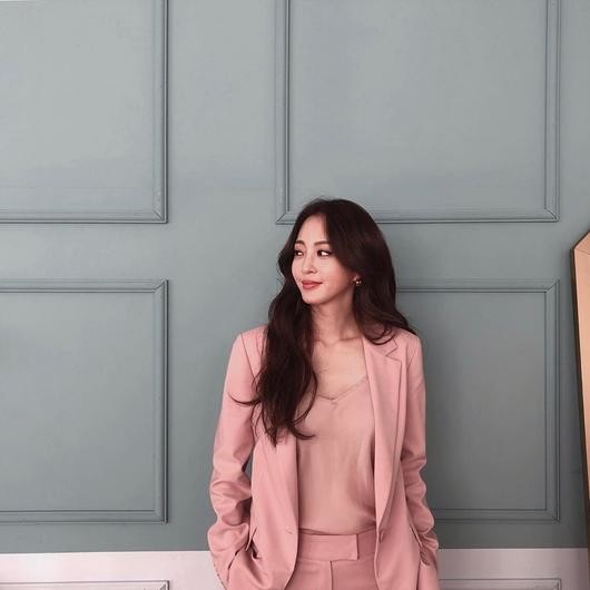 한예슬은 핑크 슈트를 입고 화사한 분위기를 자아내고 있다.