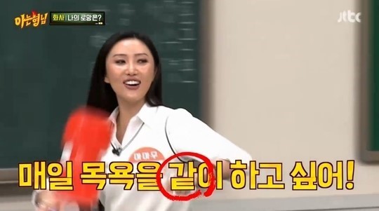 매일 하루일과가 끝난 후 사랑하는 남편과 함께 목욕하고 싶다는 것. 사랑꾼 기질에 돋보이는 화사의 답변에 출연진들은 놀라는 반응을 보였다.
