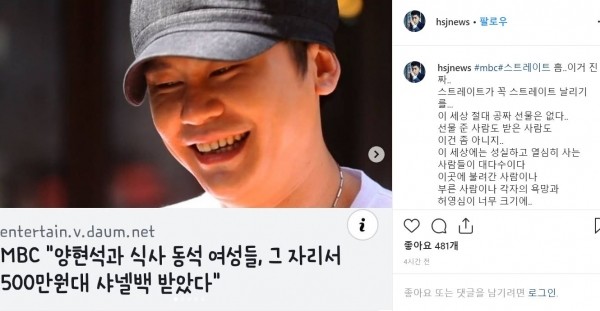 한상진은 지난 5월 29일 자신의 인스타그램에 MBC ‘스트레이트’ 보도 기사를 올리며 소신 발언을 남겼다.