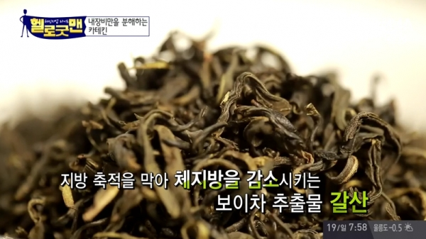 최근 방송된 채널A '헬로 굿맨'에 따르면 보이차에 풍부하게 함유된 갈산 성분은 체지방 감소 효과가 있는 것으로 알려진다. 또한 갈산은 지방 흡수율을 낮춰 체내 기름기를 제거하고 소화를 원활하게 돕는다.