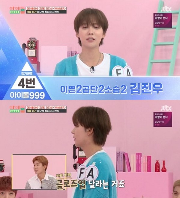 이날 김진우는 자기 PR 시간에 나서 "저는 위너에서 얼굴을 맡고 있다"고 말했다. 이어 앞 모습과 옆 모습, 뒤통수까지 자랑하며 "말이 필요 없다"고 어필했다.