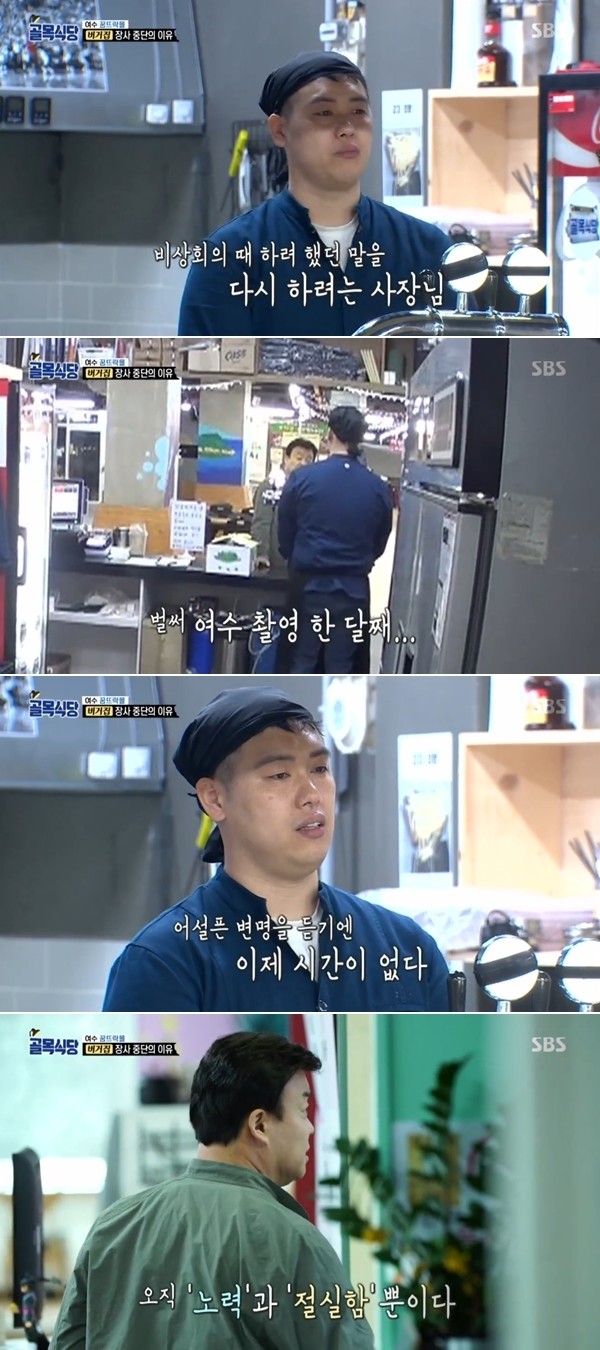 지난 방송 말미 백종원은 여수 꿈뜨락몰 사장들 몇명이 연구를 핑계로 장사 포기를 선언하자 불같이 화를 냈다. 그가 나가고 난 뒤 양식집 사장 부부가 사람들을 설득해 "어떻게든 장사를 하는게 맞다"고 다독였다. 다들 자리에서 일어나 자신의 가게로 갔고 장사 준비를 하기 시작했다.