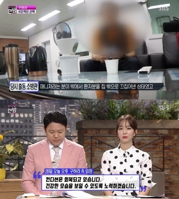 당시 현장에 출동했던 소방관은 "연기 중독으로 신고를 받았고, 매니저라는 분이 밖에서 환자분을 집밖으로 끄집어낸 상태였다. 현관문 앞에 누운 채 있었고, 환자 상태를 보니 호흡과 맥박은 있었는데 의식이 없었다"며 "응급처치를 하고 바로 이송했다"고 말했다.