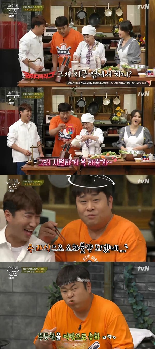 그러자 김수미는 욕을 날리며 "욕먹으러 왔으면 욕이나 실컷 먹고 가라"고 말했고, 이에 감동한 문세윤은 "여기 '수미네 반찬'이 아니라 욕 맛집"이라고 감탄했다.