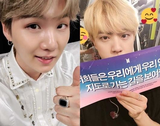공개된 사진 속 슈가는 엄지를 치켜들고 은은하게 미소 지으며 카메라를 바라보고 있고, 진은 플랜카드를 들고 진지한 눈빛으로 포즈를 취하고 있다. 바쁜 일정 속에서도 팬들에게 감사 인사를 잊지 않는 두 사람의 모습이 팬심을 저격한다.