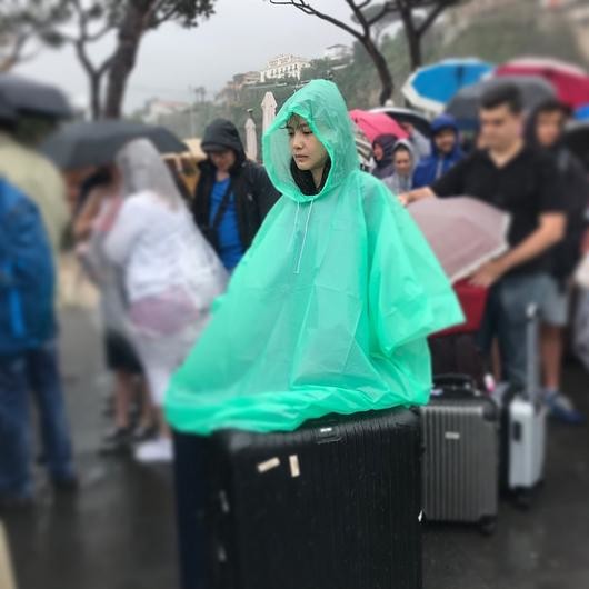 공개된 사진 속 윤승아는 우비를 입은 채 아쉬움이 가득한 표정을 짓고 있다. 윤승아는 초록색의 우비도 완벽 소화해 눈길을 끈다.