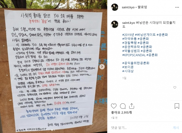 김상교 씨가 공유한 대자보에는 "올해 1월 버닝썬 가드 폭행사건을 시작으로 클럽 버닝썬 내에서 강간, 성접대, 성매매 알선, 미성년자 성착취 등 성범죄가 조직적으로 이뤄지고 있다는 사실이 밝혀졌다"며 "이 사태에는 Y사 소속 가수 이모 씨가 연루되어 있고 소속사 대표 양모 씨가 클럽의 실소유주라는 의혹이 제기됐다"고 적혔다.