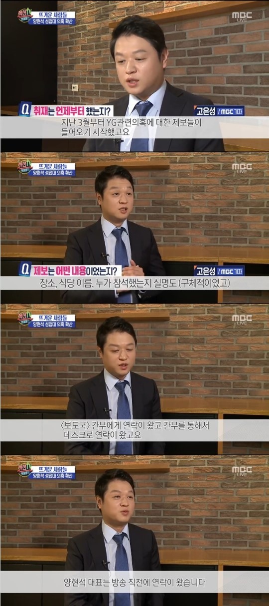 이날 방송에서 해당 사항을 취재한 MBC 고은성 기자는 "지난 3월부터 YG 관련 의혹에 대한 제보들이 들어오기 시작했다. 제보자들이 '경찰에 진술할 수 있을 만큼 확실한 내용이다'라고 했기 때문에 상당 부분에 대회 신뢰를 하게 됐다"고 밝혔다.