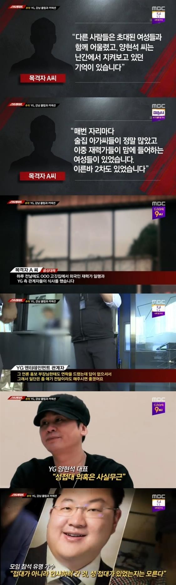 앞서 ‘스트레이트’는 27일 양현석 대표 등 YG엔터테인먼트 관계자와 아시아 재력가 등 남성 8명이 참석한 식사 자리에 여성 25명이 함께 했다고 보도했다. 여성 중 10명은 일명 정마담이 동원한 화류계 여성들이었다. 초대된 일반인 중에는 남양유업 창업자 외손녀 황하나도 있었다고 밝혔다.