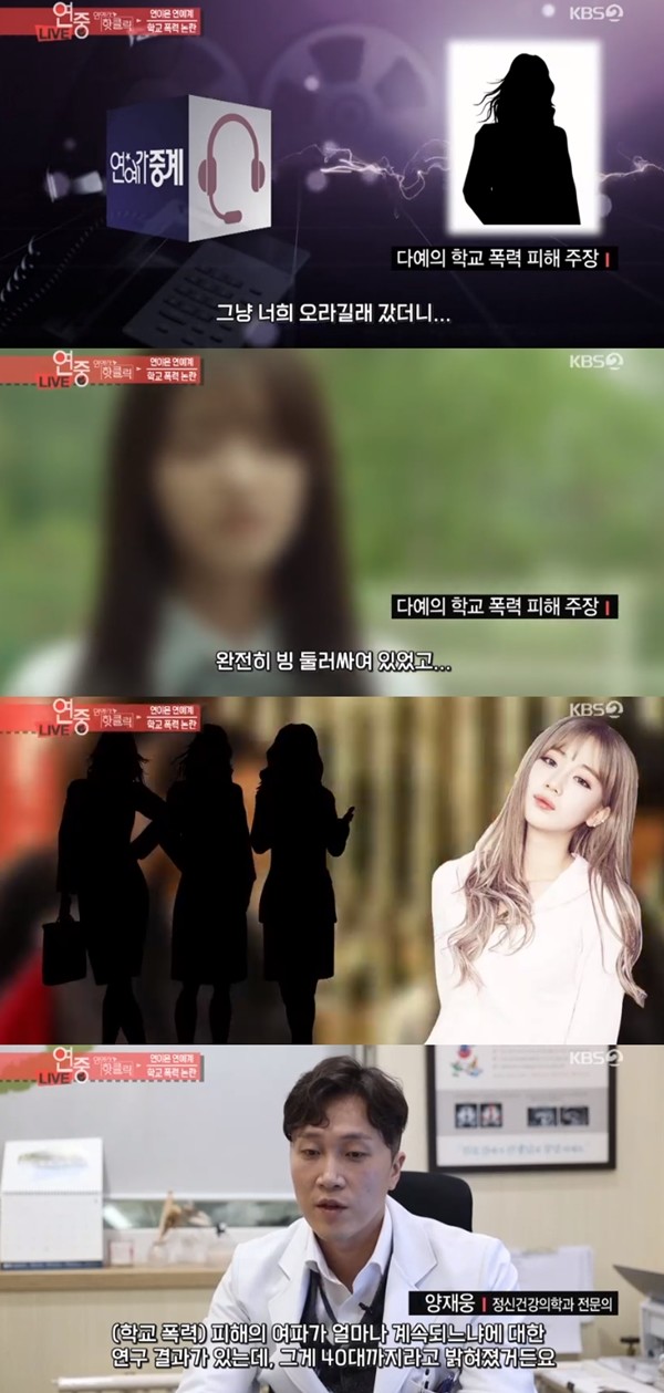 최근 방송된 KBS2 '연예가중계'는 최근 불거진 베리굿 다예의 학교폭력 의혹을 집중적으로 다뤘다.