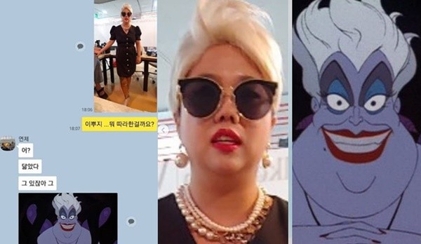 이에 제이쓴은 "어 닮았다. 그 있잖아. 그"라며 디즈니 애니메이션 '인어공주'에 등장하는 마녀 우슬라 캐릭터 사진을 전송한 내용의 대화가 공개됐다.