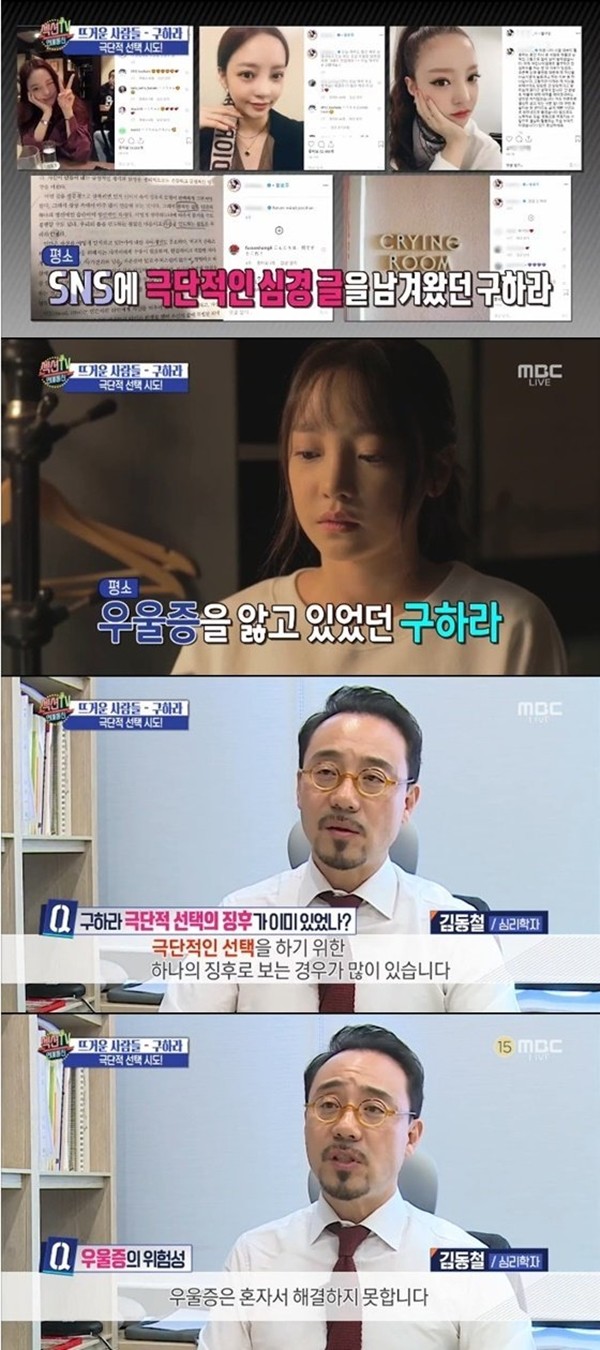그는 "구하라의 SNS를 보면 상당히 노력하고 이겨가고 있는 모습이 보인다. 하지만 '사실 나는 많이 아파요'라는 메시지다. 본인의 심정을 알게 하기 위해 SOS를 치는 거라고 보면 된다"고 설명했다.
