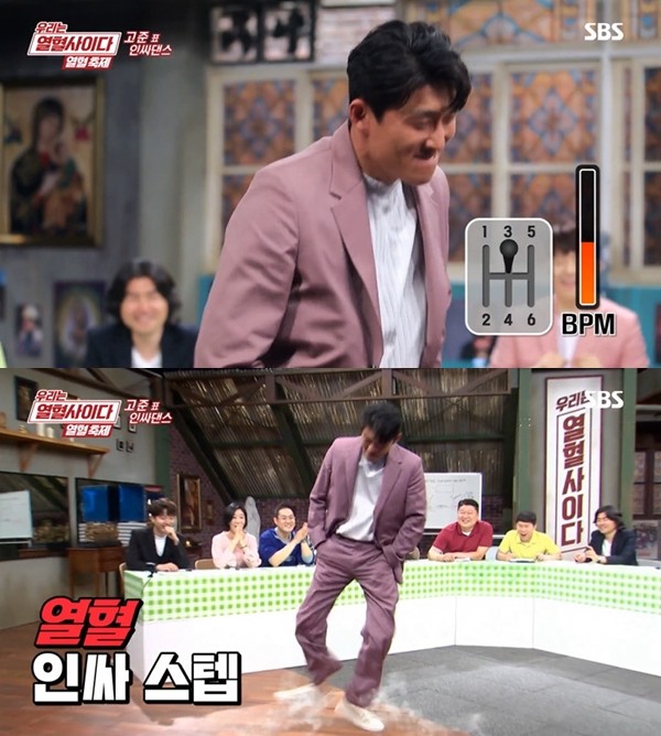 고준은 손을 주머니에 넣고 재빠르고 날렵한 춤사위로 이목을 집중시켰다. 김남길은 고준의 이러한 모습을 처음 본다는 듯 놀랍다는 표정을 지었다.