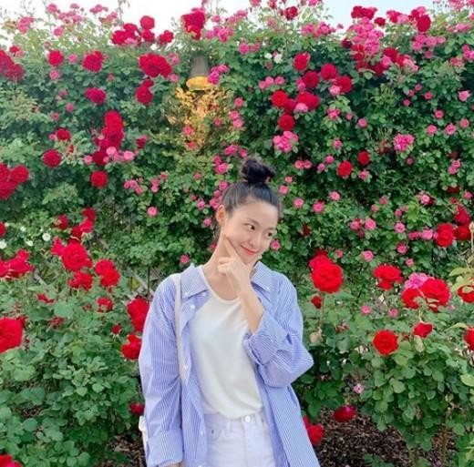 캐주얼한 옷차림을 한 설현은 장미꽃 앞에서 미소짓고 있다. 러블리한 미모가 돋보인다.