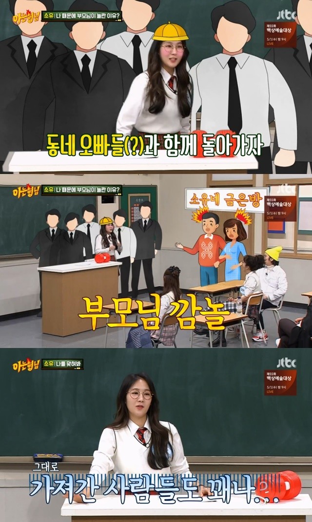 소유는 "어렸을 때 언니가 나보다 4살 위고 오빠가 8살 위다. 그래서 나랑 놀아주는 사람이 없었다. 혼자 제주도를 헤집고 다녔다. 모르는 사람한테 말걸고 그랬다. 동네 오빠들이랑 어느 순간부터 친해졌다. 놀다 보니 시간이 늦었다. 위험하니까 날 집에 데려다주겠다고 5명이 같이 오니까 부모님이 너무 놀란거다"며 금은방에 건달들을 데려온 에피소드를 공개했다.